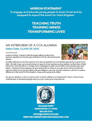 As Abby reflected on her time spent at CCS, she recognized it as a wonderful opportunity to grow in her faith. She felt it was a good environment to learn from her teachers as they walked out their lives of faith before her. Now that she is in college, she is challenged to walk out her faith in even greater ways than before. Obeying God by stepping out and serving Him in Kenya is one way she is doing just that. We rejoice in what God is doing in Abby’s life and delight to see how God will continue to use her to make a difference in this world for His Kingdom. Keep up the great work, Abby!