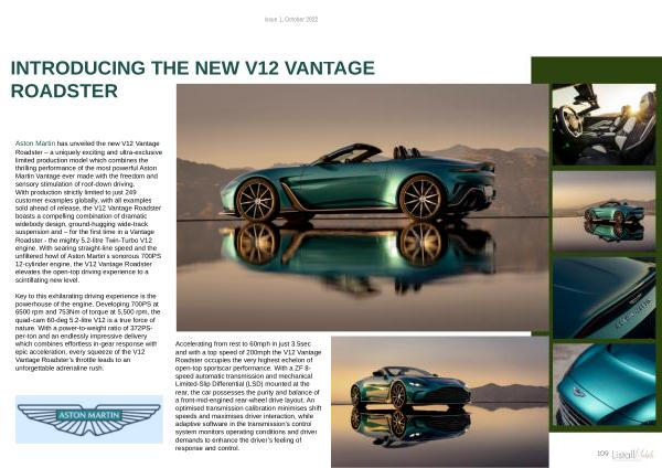 Aston Martin has unveiled the new V12 Vantage Roadster – a uniquely exciting and ultra-exclusive limited production model which combines the thrilling performance of the most powerful Aston Martin Vantage ever made with the freedom and sensory stimulation of roof-down driving . With production strictly limited to just 249 customer examples globally , with all examples sold ahead of release , the V12 Vantage Roadster boasts a compelling combination of dramatic widebody design , ground-hugging wide-track suspension and – for the first time in a Vantage Roadster - the mighty 5.2-litre Twin-Turbo V12 engine . With searing straight-line speed and the unfiltered howl of Aston Martin ’ s sonorous 700PS 12-cylinder engine , the V12 Vantage Roadster elevates the open-top driving experience to a scintillating new level .