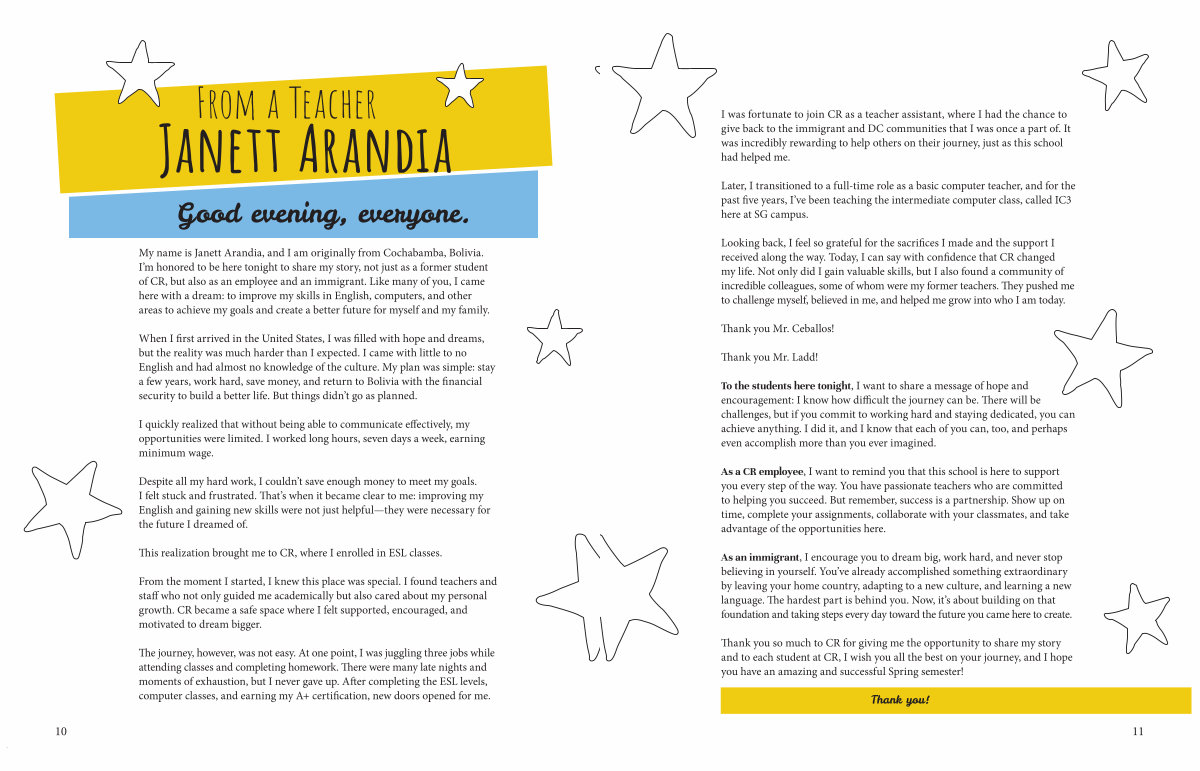 I was fortunate to join CR as a teacher assistant, where I had the chance to give back to the immigrant and DC communities that I was once a part of. It was incredibly rewarding to help others on their journey, just as this school had helped me.