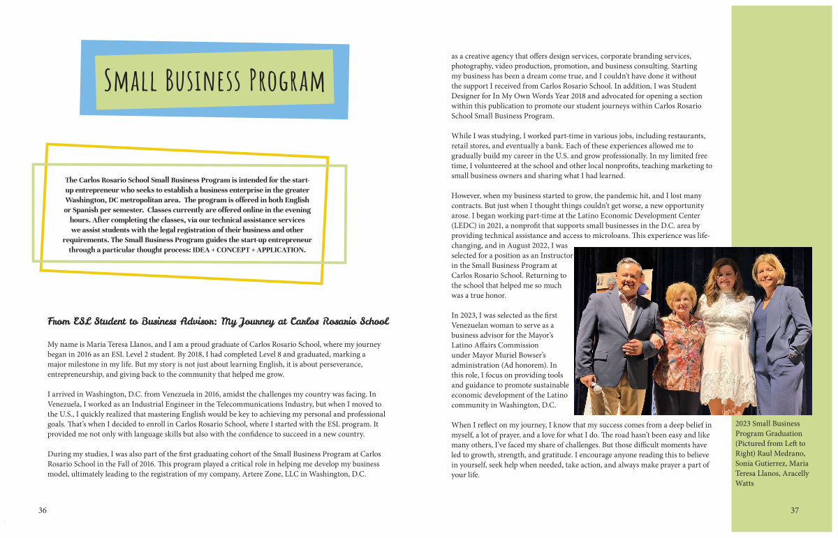 My name is Maria Teresa Llanos, and I am a proud graduate of Carlos Rosario School, where my journey began in 2016 as an ESL Level 2 student. By 2018, I had completed Level 8 and graduated, marking a major milestone in my life. But my story is not just about learning English, it is about perseverance, entrepreneurship, and giving back to the community that helped me grow.