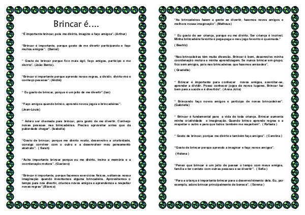“ Brincar é importante para conhecer novos amigos, exercitar-se, aprender a dividir. Posso conhecer jogos de novos lugares. Brincar faz bem para a saúde e é divertido”.( Anna Júlia)