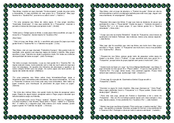 “ Voltei para o Colégio após as férias, e cada grupo tinha escolhido um jogo. O nosso foi o“ Futqueima”. Gostei mesmo foi“ Queima o Rio”.