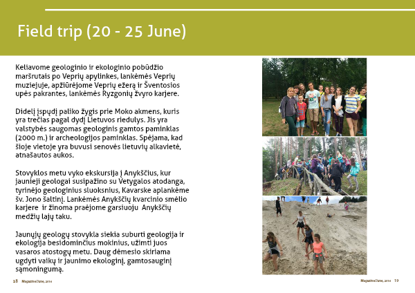 Stovyklos metu vyko ekskursija į Anykščius, kur jaunieji geologai susipažino su Vetygalos atodanga, tyrinėjo geologinius sluoksnius, Kavarske aplankėme šv. Jono šaltinį. Lankėmės Anykščių kvarcinio smėlio karjere ir žinoma praėjome garsiuoju Anykščių medžių lajų taku.