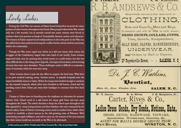 Unique to Salem since its founding was the emphasis on education for women. Salem’s Girls School acted as a safe haven for many girls from war-torn areas throughout the South. The town's decision to keep the school open throughout the War appealed to many young women and their families, who were reassured by the relative safety. Some of Salem’s returning nurses acted as teachers here, while others worked to establish a school system in the still-growing town of Winston. With unwavering strength, brilliance, and will to carry on, the women of the area ensured that their towns would not succumb to the War or its aftermath.