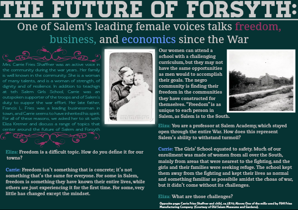 Mrs. Carrie Fries Shaffner, a native of Salem, holds a special place in our town’s history. She was close to the battlefield before she returned to the home front. Her family is well known in the community. She is a woman of many talents, but she is also a woman of strength, of dignity and of resilience. For all of these reasons, we asked her to sit with Eliza Kremer and discuss a range of topics that center around the future of Salem.