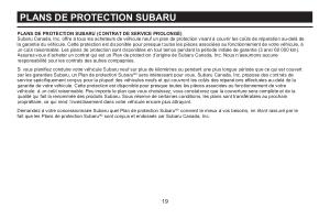 PLANS DE PROTECTION SUBARU ( CONTRAT DE SERVICE PROLONGÉ ) Subaru Canada , Inc . offre à tous les acheteurs de véhicule neuf un plan de protection visant à couvrir les coûts de réparation au-delà de la garantie du véhicule . Cette protection est disponible pour presque toutes les pièces associées au fonctionnement de votre véhicule , à un coût raisonnable . Les plans de protection sont disponibles en tout temps pendant la période initiale de garantie ( 3 ans / 60 000 km ). Assurez-vous d ’ acheter un contrat qui est un Plan de protection d ’ origine de Subaru Canada , Inc . Nous n ’ assumons aucune responsabilité pour les contrats des autres compagnies .