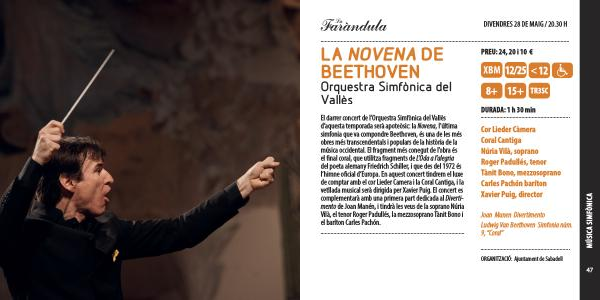 El darrer concert de l ’ Orquestra Simfònica del Vallès d ’ aquesta temporada serà apoteòsic : la Novena , l ’ última simfonia que va compondre Beethoven , és una de les més obres més transcendentals i populars de la història de la música occidental . El fragment més conegut de l ’ obra és el final coral , que utilitza fragments de L ’ Oda a l ’ alegria del poeta alemany Friedrich Schiller , i que des del 1972 és l ’ himne oficial d ’ Europa . En aquest concert tindrem el luxe de comptar amb el cor Lieder Camera i la Coral Cantiga , i la vetllada musical serà dirigida per Xavier Puig . El concert es complementarà amb una primera part dedicada al Divertimento de Joan Manén , i tindrà les veus de la soprano Núria Vilà , el tenor Roger Padullés , la mezzosoprano Tànit Bono i el baríton Carles Pachón .