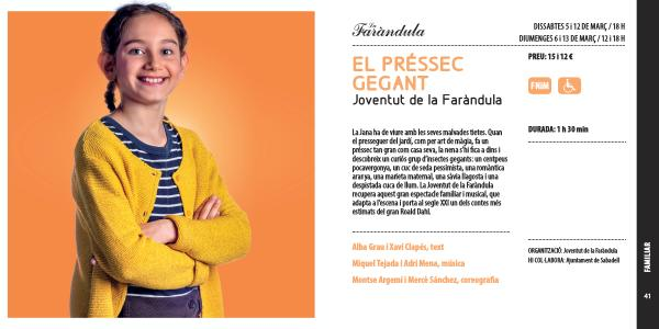 La Jana ha de viure amb les seves malvades tietes . Quan el presseguer del jardí , com per art de màgia , fa un préssec tan gran com casa seva , la nena s ’ hi fica a dins i descobreix un curiós grup d ’ insectes gegants : un centpeus pocavergonya , un cuc de seda pessimista , una romàntica aranya , una marieta maternal , una sàvia llagosta i una despistada cuca de llum . La Joventut de la Faràndula recupera aquest gran espectacle familiar i musical , que adapta a l ’ escena i porta al segle XXI un dels contes més estimats del gran Roald Dahl .