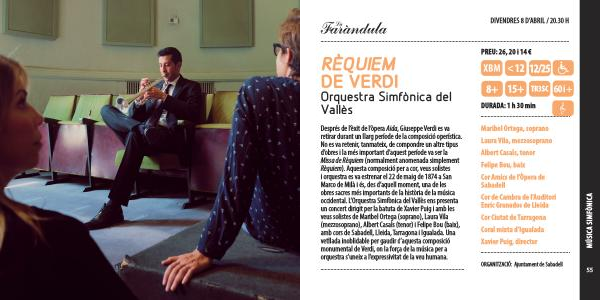 Després de l ’ èxit de l ’ òpera Aida , Giuseppe Verdi es va retirar durant un llarg període de la composició operística . No es va retenir , tanmateix , de compondre un altre tipus d ’ obres i la més important d ’ aquest període va ser la Missa de Rèquiem ( normalment anomenada simplement Rèquiem ). Aquesta composició per a cor , veus solistes i orquestra es va estrenar el 22 de maig de 1874 a San Marco de Milà i és , des d ’ aquell moment , una de les obres sacres més importants de la història de la música occidental . L ’ Orquestra Simfònica del Vallès ens presenta un concert dirigit per la batuta de Xavier Puig i amb les veus solistes de Maribel Ortega ( soprano ), Laura Vila ( mezzosoprano ), Albert Casals ( tenor ) i Felipe Bou ( baix ), amb cors de Sabadell , Lleida , Tarragona i Igualada . Una vetllada inoblidable per gaudir d ’ aquesta composició monumental de Verdi , on la força de la música per a orquestra s ’ uneix a l ’ expressivitat de la veu humana .