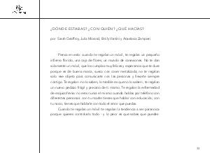 Piensa en esto: cuando te regalan un móvil, te regalan un pequeño infierno florido, una caja de flores, un mundo de conexiones. No te dan solamente un móvil, que los cumplas muy felices y esperamos que te dure porque es de buena marca, sueco con cover metalizada; no te regalan solo ese objeto para comunicarte con las personas y llevarte siempre contigo. Te regalan-no lo saben, lo terrible es que no lo saben-, te regalan un nuevo pedazo frágil y precario de ti mismo. Te regalan la enfermedad de esquizofrenia: no eres nunca el mismo cuando hablas por teléfono con diferentes personas: con tu madre tienes que hablar con educación; con tu novio, tienes que hablarle con todo el amor que puedas.