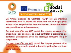 Un‘‘ Point Critique de Contrôle( CCP)’’ est un moment identifiable dans la chaîne de production où un risque peut arriver. Pour empêcher les risques d’ arriver, une action et / ou une procédure est mis en oeuvre;