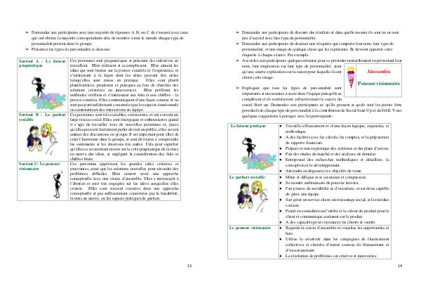 ➢ Expliquez que tous les types de personnalité sont importants et nécessaires à avoir dans l’ équipe puisqu ' ils se complètent et ils renforceront collectivement le succès du social Start up. Demandez aux participants ce qu’ ils pensent et quels sont les points forts potentiels de chaque type de personnalité à la contribution de Social Start Up et du GAE. Voici quelques suggestions à partager avec les participants: