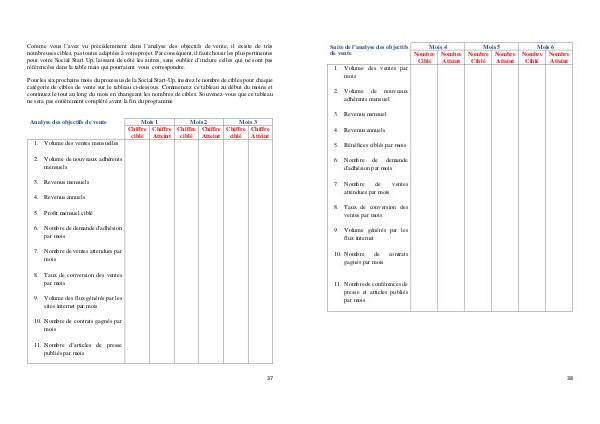 Pour les six prochains mois du processus de la Social Start-Up, insérez le nombre de cibles pour chaque catégorie de cibles de vente sur le tableau ci-dessous. Commencez ce tableau au début du moins et continuez le tout au long du mois en changeant les nombres de cibles. Souvenez-vous que ce tableau ne sera pas entièrement complété avant la fin du programme