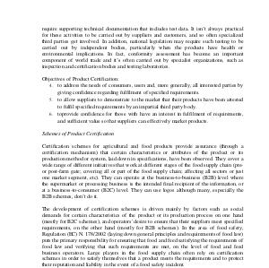 Certification schemes for agricultural and food products provide assurance( through a certification mechanism) that certain characteristics or attributes of the product or its production method or system, laid down in specifications, have been observed. They cover a wide range of different initiatives that work at different stages of the food supply chain( preor post-farm gate; covering all or part of the food supply chain; affecting all sectors or just one market segment, etc). They can operate at the business-to-business( B2B) level where the supermarket or processing business is the intended final recipient of the information, or at a business-to-consumer( B2C) level. They can use logos although many, especially the B2B schemes, don ‟ t do it.
