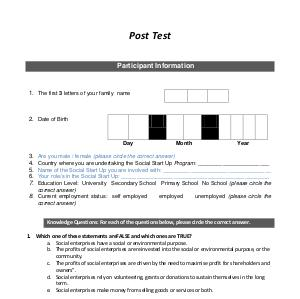 3. Are you male / female( please circle the correct answer) 4. Country where you are undertaking the Social Start Up Program: _______________________ 5. Name of the Social Start Up you are involved with: ___________________________________ 6. Your role / s in the Social Start Up: ________________________________________________ 7. Education Level: University Secondary School Primary School No School( please circle the correct answer) 8. Current employment status: self employed employed unemployed( please circle the correct answer)