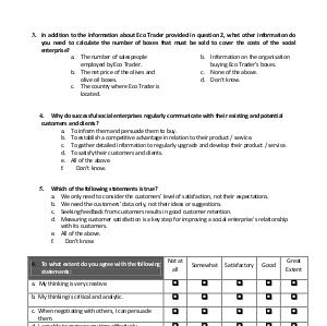3. In addition to the information about Eco Trader provided in question 2, what other information do you need to calculate the number of boxes that must be sold to cover the costs of the social enterprise? a. The number of salespeople employed by Eco Trader. b. The net price of the olives and olive oil boxes. c. The country where Eco Trader is located. b. Information on the organisation buying Eco Trader’ s boxes. c. None of the above. d. Don’ t know.