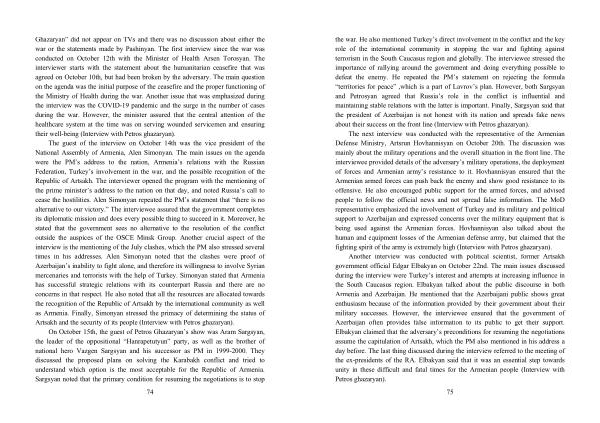 the war . He also mentioned Turkey ’ s direct involvement in the conflict and the key role of the international community in stopping the war and fighting against terrorism in the South Caucasus region and globally . The interviewee stressed the importance of rallying around the government and doing everything possible to defeat the enemy . He repeated the PM ’ s statement on rejecting the formula “ territories for peace ” , which is a part of Lavrov ’ s plan . However , both Sargsyan and Petrosyan agreed that Russia ’ s role in the conflict is influential and maintaining stable relations with the latter is important . Finally , Sargsyan said that the president of Azerbaijan is not honest with its nation and spreads fake news about their success on the front line ( Interview with Petros ghazaryan ).