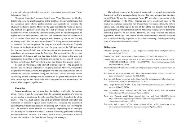 The political economy of the selected media outlets is enough to explain the framing of the PM ’ s messages during the war . The study revealed that the stateowned Public TV and the independent Factor TV were always supportive of the official statements of the Prime Minister and never questioned those in the interviews conducted during the war . Unlike these two media outlets , the 168 . am showed rally-round-the-flag for the first 25 days of the war , but after that it started questioning the government narrative about Armenians winning the war despite the censorship imposed on the media . Therefore , the study confirms the second hypotheses , which says “ The support for the Prime Minister ’ s narrative about the war in the media heavily depended on the political economy , including ownership type , of the selected three media outlets .”