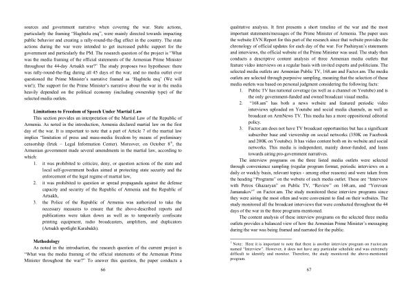 sources and government narrative when covering the war . State actions , particularly the framing “ Haghtelu enq ”, were mainly directed towards impacting public behavior and creating a rally-round-the-flag effect in the country . The state actions during the war were intended to get increased public support for the government and particularly the PM . The research question of the project is “ What was the media framing of the official statements of the Armenian Prime Minister throughout the 44-day Artsakh war ?” The study proposes two hypotheses : there was rally-round-the-flag during all 45 days of the war , and no media outlet ever questioned the Prime Minister ’ s narrative framed as ‘ Haghtelu enq ’ ( We will win !); The support for the Prime Minister ’ s narrative about the war in the media heavily depended on the political economy ( including ownership type ) of the selected media outlets .