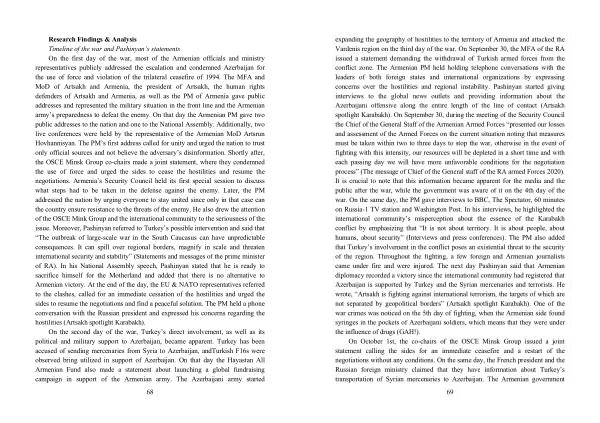 Research Findings & Analysis Timeline of the war and Pashinyan ’ s statements On the first day of the war , most of the Armenian officials and ministry representatives publicly addressed the escalation and condemned Azerbaijan for the use of force and violation of the trilateral ceasefire of 1994 . The MFA and MoD of Artsakh and Armenia , the president of Artsakh , the human rights defenders of Artsakh and Armenia , as well as the PM of Armenia gave public addresses and represented the military situation in the front line and the Armenian army ’ s preparedness to defeat the enemy . On that day the Armenian PM gave two public addresses to the nation and one to the National Assembly . Additionally , two live conferences were held by the representative of the Armenian MoD Artsrun Hovhannisyan . The PM ’ s first address called for unity and urged the nation to trust only official sources and not believe the adversary ’ s disinformation . Shortly after , the OSCE Minsk Group co-chairs made a joint statement , where they condemned the use of force and urged the sides to cease the hostilities and resume the negotiations . Armenia ’ s Security Council held its first special session to discuss what steps had to be taken in the defense against the enemy . Later , the PM addressed the nation by urging everyone to stay united since only in that case can the country ensure resistance to the threats of the enemy . He also drew the attention of the OSCE Mink Group and the international community to the seriousness of the issue . Moreover , Pashinyan referred to Turkey ’ s possible intervention and said that “ The outbreak of large-scale war in the South Caucasus can have unpredictable consequences . It can spill over regional borders , magnify in scale and threaten international security and stability ” ( Statements and messages of the prime minister of RA ). In his National Assembly speech , Pashinyan stated that he is ready to sacrifice himself for the Motherland and added that there is no alternative to Armenian victory . At the end of the day , the EU & NATO representatives referred to the clashes , called for an immediate cessation of the hostilities and urged the sides to resume the negotiations and find a peaceful solution . The PM held a phone conversation with the Russian president and expressed his concerns regarding the hostilities ( Artsakh spotlight Karabakh ).
