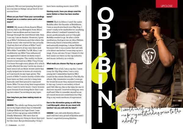 OBIBINI : My mum is from Asante Efijasi and my dad is an Akwapem from Aburi . Since I am an Akan and we trace our lineage through the matrilineal side , then I can say I am an Asante . However , I grew up at Mile 7 , Achimota and this where the whole music vibe started for me , actually . I had my first set of fans at Mile 7 and I had two concerts of my own there and OB is Mile 7 and Mile 7 is OB . Also , I can confidently say Mile 7 has influenced my approach to music in many ways I can never imagine . The reality on those streets is hard and as a Mile 7 boy , I ’ d say I ’ ve been through every phase of it ; which really affected the way I write my music . I have seen it all on those streets and it has really helped me in terms of creativity as I can touch on any topic given . The youth of Mile 7 consist mostly of kids who have been on their own for a long time basically and I feel proud to represent them . Mile 7 is one of my best inspirations when I want to write music . I have lessons upon lessons from living there that I can tap into when I ’ m writing on any topic .