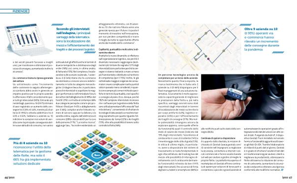 Capillarità , puntualità e molto altro : le dinamiche odierne Anzitutto le nuove dinamiche si riflettono sull ’ organizzazione logistica , sia perché è diventato necessario raggiungere destinazioni più lontane ( lo segnala il 21 % degli intervistati ) sia in particolare perché le consegne si stanno rivelando a mano a mano più frammentate e distribuite sul territorio di competenza ( per il 70 %). Inoltre , le già sottolineate maggiori esigenze dei consumatori creano complicazioni sotto punti di vista in passato meno considerati , in quanto sono sempre più comuni richieste specifiche in termini di puntualità , orari specifici o consegna al piano . Ecco , dunque , perché l ’ 82 % del campione intervistato riconosce che i software per la gestione della flotta sono utili ad aumentare l ’ efficienza del “ last mile delivery ”, consentendo di sfruttare le tecnologie di data analytics e machine learning soprattutto per quanto riguarda l ’ ottimizzazione dei tempi ( 22 %) e dei tragitti ( 13 %), oltre alla possibilità di tenere sotto controllo la flotta ( 18 %).