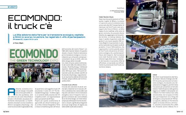 FORD TRUCKS ITALIA Dopo la prima partecipazione al Transpotec Logitec di Milano , la visione e il percorso verso le emissioni zero annunciati alla IAA Transportation di Hannover da Ford Trucks sono proseguiti alla Fiera di Rimini : un ’ altra tappa di una roadmap volta verso la green economy che prevede diversi obiettivi da raggiungere nel brevemedio termine . La startup italiana , che dopo il cambio di gestione vede alla guida di una nuova squadra l ’ AD Lorenzo Boghich , ha presentato in anteprima nazionale la principale novità di prodotto : il truck 100 % elettrico , che rappresenta il primo grande passo di Ford Trucks nel percorso di transizione ecologica che caratterizzerà il futuro del trasporto . Nell ’ occasione sono stati illustrati anche i risultati ottenuti negli ultimi mesi , l ’ andamento del mercato e le prossime sfide da affrontare , consacrando così ufficialmente la presenza di Ford Trucks sul territorio italiano . eDAILY IVECO