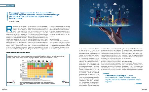 Rivoluzionerà le nostre vite , le vite di tutti noi . L ’ innovazione tecnologica , la nuova rivoluzione in cui siamo immersi noi , uomini e donne del ventunesimo secolo , avrà un impatto radicale sul mondo dei trasporti e della logistica , su come si muoveranno persone e merci . Non tutti i cambiamenti viaggeranno alla stessa velocità , la decarbonizzazione dei veicoli e dei sistemi di trasporto , per esempio , necessita ancora di ingenti investimenti in ricerca e sviluppo in alcuni comparti per trovare le soluzioni adeguate , ma il traguardo è chiaro . È ineludibile : i drammatici cambiamenti climatici , gli eventi estremi che hanno caratterizzato l ’ anno appena trascorso , hanno spazzato via qualunque dubbio . Alla rivoluzione tecnologica è dedicato il quarto capitolo del documento “ Mobilità e logistica sostenibili . Analisi e indirizzi strategici per il futuro ” licenziato dal Ministero delle Infrastrutture e dei Trasporti nell ’ ottobre dello scorso anno . Documento che , grazie al lavoro e al coinvolgimento degli esperti e di tutti gli stakeholders del settore , disegna la situazione dell ’ oggi e prefigura le sfide per il domani e le criticità da risolvere nei prossimi dieci anni . Il capitolo è stato curato da Vito Mauro , professore di Ingegneria al Politecnico di Torino e all ’ epoca esperto della Struttura Tecnica di Missione del Ministero .