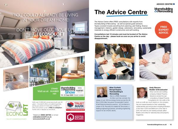 The Advice Centre offers FREE consultations with experts from Homebuilding & Renovating- as well as special guest advisors. Topics covered include everything from planning, plot finding, finance management, interiors, garden design, extensions, renovating, sustainable materials to energy efficient construction and self-building.