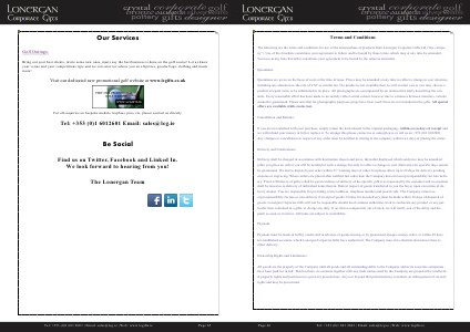 The following are the terms and conditions for use of the and purchase of products from Lonergan Corporate Gifts Ltd(“ the company”). Use of this brochure constitutes your agreement to follow and be bound by these terms, which may at any time be amended. Your use at any time thereafter constitutes your agreement to be bound by the terms as amended.