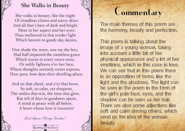 This poem is talking about the image of a young woman, taking into account a little bit of her physical appearance and a lot of her emotions, which in this case is love. We can see that in this poem there is an opposition of terms like the light and the shadows. The light can be seen in the poem in the form of the girl’s pale face, eyes, and the shadow can be seen as her hair. There are also some adjectives like soft and calm among others, which send us the idea of the woman beauty.
