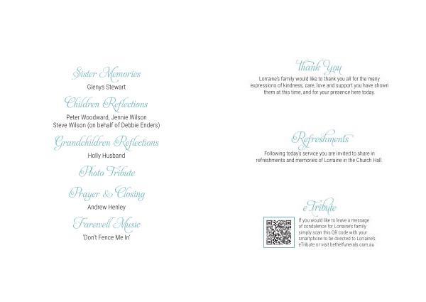 If you would like to leave a message of condolence for Lorraine ’ s family simply scan this QR code with your smartphone to be directed to Lorraine ’ s eTribute or visit bethelfunerals . com . au