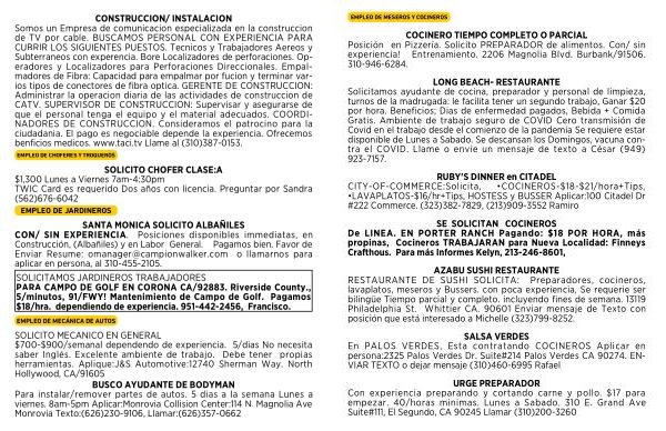 LONG BEACH- RESTAURANTE Solicitamos ayudante de cocina , preparador y personal de limpieza , turnos de la madrugada : le facilita tener un segundo trabajo , Ganar $ 20 por hora . Beneficios ; Dias de enfermedad pagados , Bebida + Comida Gratis . Ambiente de trabajo seguro de COVID Cero transmisión de Covid en el trabajo desde el comienzo de la pandemia Se requiere estar disponible de Lunes a Sabado . Se descansan los Domingos , vacuna contra el COVID . Llame o envie un mensaje de texto a César ( 949 ) 923-7157 .