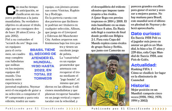 el desequilibrio del tridente ofensivo que impone tanto respeto a los rivales . A Qatar llega con previos tropiezos en 2014 y 2018 . El más humillante en su mundial hace 8 años . En Rusia solo llegó a cuartos de final donde perdió con Bélgica 2-1 . Para esta Copa del Mundo repiten como rivales de grupo Suiza y Serbia , que junto con Camerún no parecen grandes escollos para ganar el sector y avanzar a mejores pastos . No hay mañana para Brasil , este mundial será el último en plenitud de Neymar y deberá aprovecharlo .