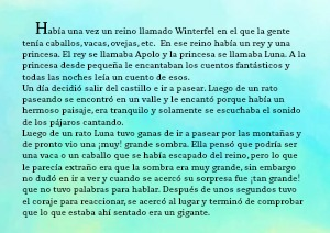 Había una vez un reino llamado Winterfel en el que la gente tenía caballos, vacas, ovejas, etc. En ese reino había un rey y una princesa. El rey se llamaba Apolo y la princesa se llamaba Luna. A la princesa desde pequeña le encantaban los cuentos fantásticos y todas las noches leía un cuento de esos.