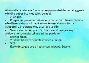 Al otro día la princesa fue muy temprano a hablar con el gigante y le dijo debes irte muy lejos de aquí.
