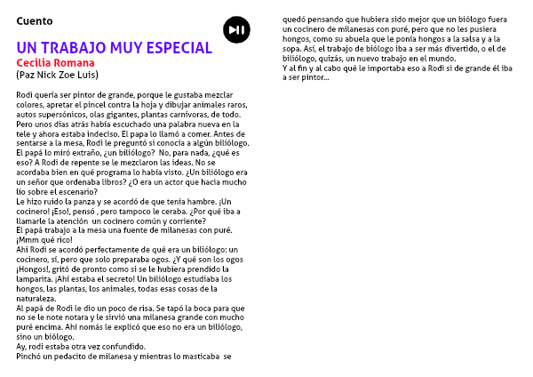 Rodi quería ser pintor de grande, porque le gustaba mezclar colores, apretar el pincel contra la hoja y dibujar animales raros, autos supersónicos, olas gigantes, plantas carnívoras, de todo. Pero unos días atrás había escuchado una palabra nueva en la tele y ahora estaba indeciso. El papa lo llamó a comer. Antes de sentarse a la mesa, Rodi le preguntó si conocía a algún biliólogo. El papá lo miró extraño, ¿un biliólogo? No, para nada, ¿qué es eso? A Rodi de repente se le mezclaron las ideas. No se acordaba bien en qué programa lo había visto. ¿Un biliólogo era un señor que ordenaba libros? ¿O era un actor que hacia mucho lío sobre el escenario?