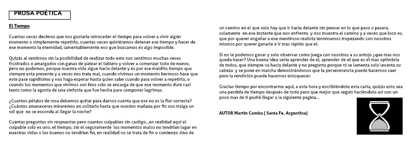 Quizás al sentirnos sin la posibilidad de realizar todo esto nos sentimos muchas veces frustrados o amargados con ganas de patear el tablero y volver a comenzar todo de nuevo, pero no podemos, porque nuestra vida sigue hacia delante y es por ese maldito tiempo que siempre esta presente y a veces nos trata mal, cuando vivimos un momento hermoso hace que este pase rapidísimo y nos haga esperar hasta quien sabe cuando para volver a repetirlo, o cuando los momentos que vivimos son feos solo se encarga de que ese momento dure casi tanto como la agonía de una sinfonía que fue hecha para componer lagrimas.