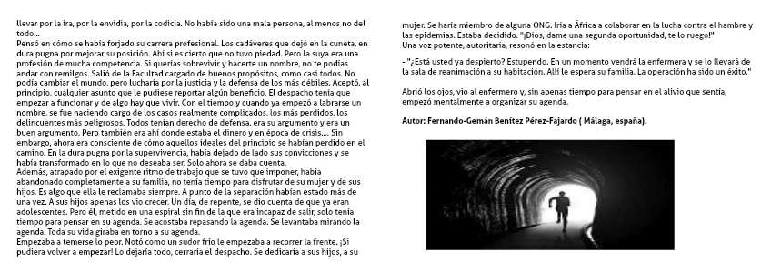 mujer. Se haría miembro de alguna ONG. Iría a África a colaborar en la lucha contra el hambre y las epidemias. Estaba decidido. "¡Dios, dame una segunda oportunidad, te lo ruego!"
