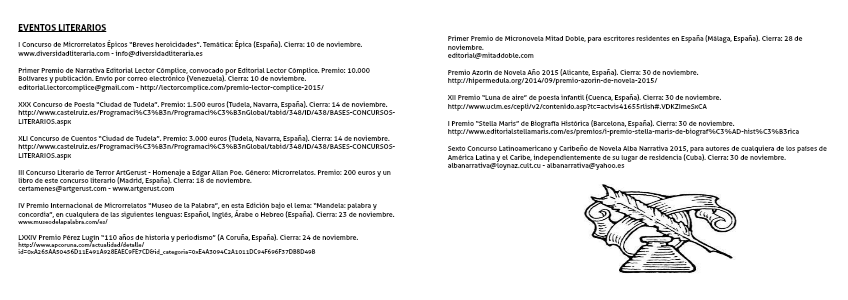 Primer Premio de Narrativa Editorial Lector Cómplice, convocado por Editorial Lector Cómplice. Premio: 10.000 Bolívares y publicación. Envío por correo electrónico (Venezuela). Cierra: 10 de noviembre.