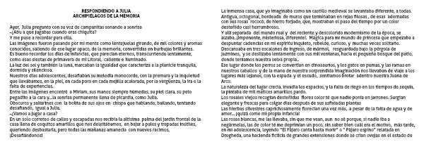 Descansaba en tres escalones de ingreso, de mármol, resguardada bajo la pérgola de jazmines, y se deslizaba lentamente con sus mil ventanas, hacia el pequeño bosque del patio, donde teníamos nuestra selva propia..