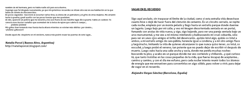 Sigo aquí anclado, sin traspasar el límite de la ciudad, como si esta extraña vida desechase cuanto hice o dejé de hacer fuera del cinturón de cemento. Es un circuito cerrado, se repite cada noche, empiezo por un monte pelado y llego hasta un extraño parque donde duerme un lagarto. Luego bajo por mi calle, y veo mi imagen desorientada sentada en un portal, fumando con ansias de vida nueva, y sigo, sigo bajando, para ver una pareja sentada bajo un arco monumental, y me veo a mí mismo mintiendo y balbuceando mi cruel cobardía, sólo para ver en unos ojos amigos el brillo del desencanto…quizás intuí algo, quizás os intuí a ambos, a mi extraño amigo de cara pálida, herencia igual a condena, y a mi otro amigo flaco y larguirucho, imitando la vida de quienes alcanzaron lo que nunca quiso tener…os intuí, os escuché, y luego probé el veneno, tan potente que no puedo dejar de escribir ni después de muerto. Luego subo hacia una calle ancha y sucia, donde me perdía muchas noches buscando tu piso, y acabo en un parque donde me veo corriendo y chillando…y qué curioso tú, que tanto insistías en las cosas pequeñas de la vida, que fueras incapaz de aceptarme…camino y camino, y con el día me esfumo, pero cada noche intento reunir todos los átomos de energía que me envuelven para convertirlos en algo sólido, para volver a vivir, para dejar de vagar en el recuerdo.
