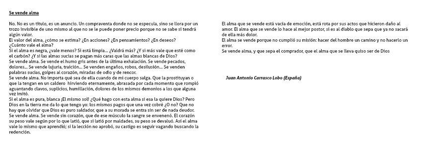 Se vende alma. Se vende sin corazón, que de ese músculo la sangre se envenenó. El corazón su peso vale según por lo que latió, que si latió por maldades, su peso se devaluó. Así el alma vale lo mismo que aprendió; si la lección no aprobó, su castigo es seguir vagando buscando la redención.