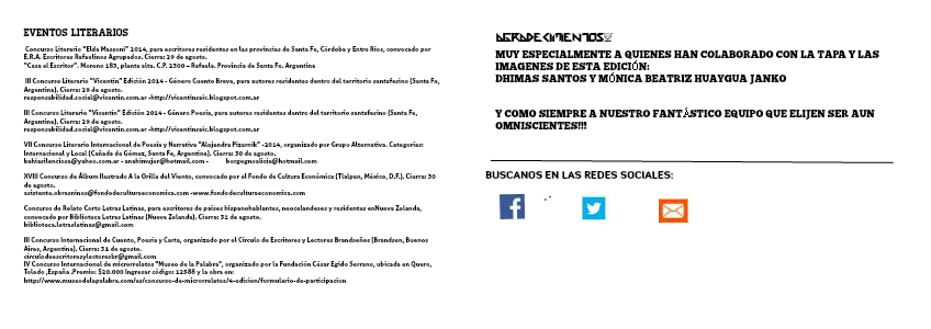 III Concurso Internacional de Cuento, Poesía y Carta, organizado por el Círculo de Escritores y Lectores Brandseños (Brandsen, Buenos Aires, Argentina). Cierra: 31 de agosto.