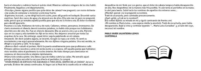 “JOVEN PAREJA DE ESPOSOS FUE ASESINADA A TIROS EN EL CENTRO DE LA CIUDAD”, leí en la portada. El dolor de cabeza continuaba. Al llegar casi al final de la cuadra ella se volteó para despedirse de mí. Noté, por sus gestos, que el dolor de cabeza tampoco había desaparecido en ella. Nos despedimos de la manera más fría posible. Yo aún tenía el periódico en la mano; lo abrí para leerlo