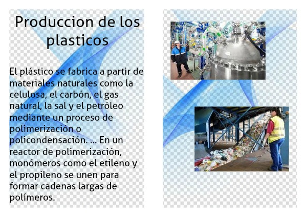 El plástico se fabrica a partir de materiales naturales como la celulosa, el carbón, el gas natural, la sal y el petróleo mediante un proceso de polimerización o policondensación. ... En un reactor de polimerización, monómeros como el etileno y el propileno se unen para formar cadenas largas de polímeros.