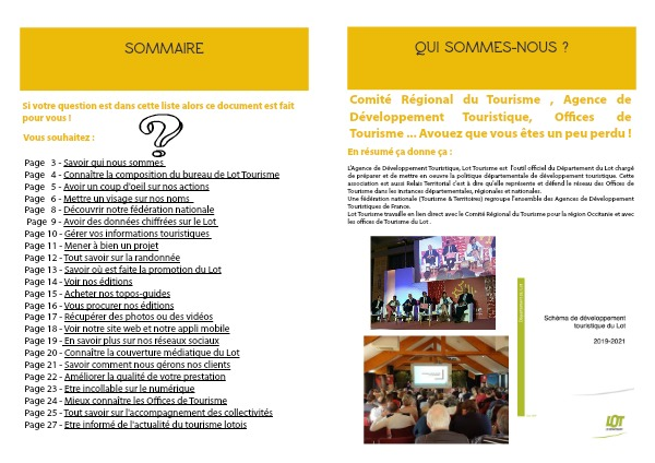 Page 3 - Savoir qui nous sommes Page 4 - Connaître la composition du bureau de Lot Tourisme Page 5 - Avoir un coup d'oeil sur nos actions Page 6 - Mettre un visage sur nos noms Page 8 - Découvrir notre fédération nationale