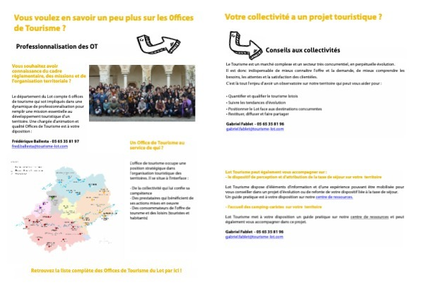 Le département du Lot compte 6 offices de tourisme qui sot impliqués dans une dynamique de professionnalisation pour remplir une mission essentielle au développement touristique d'un territoire. Une chargée d'animation et qualité Offices de Tourisme est à votre diposition :