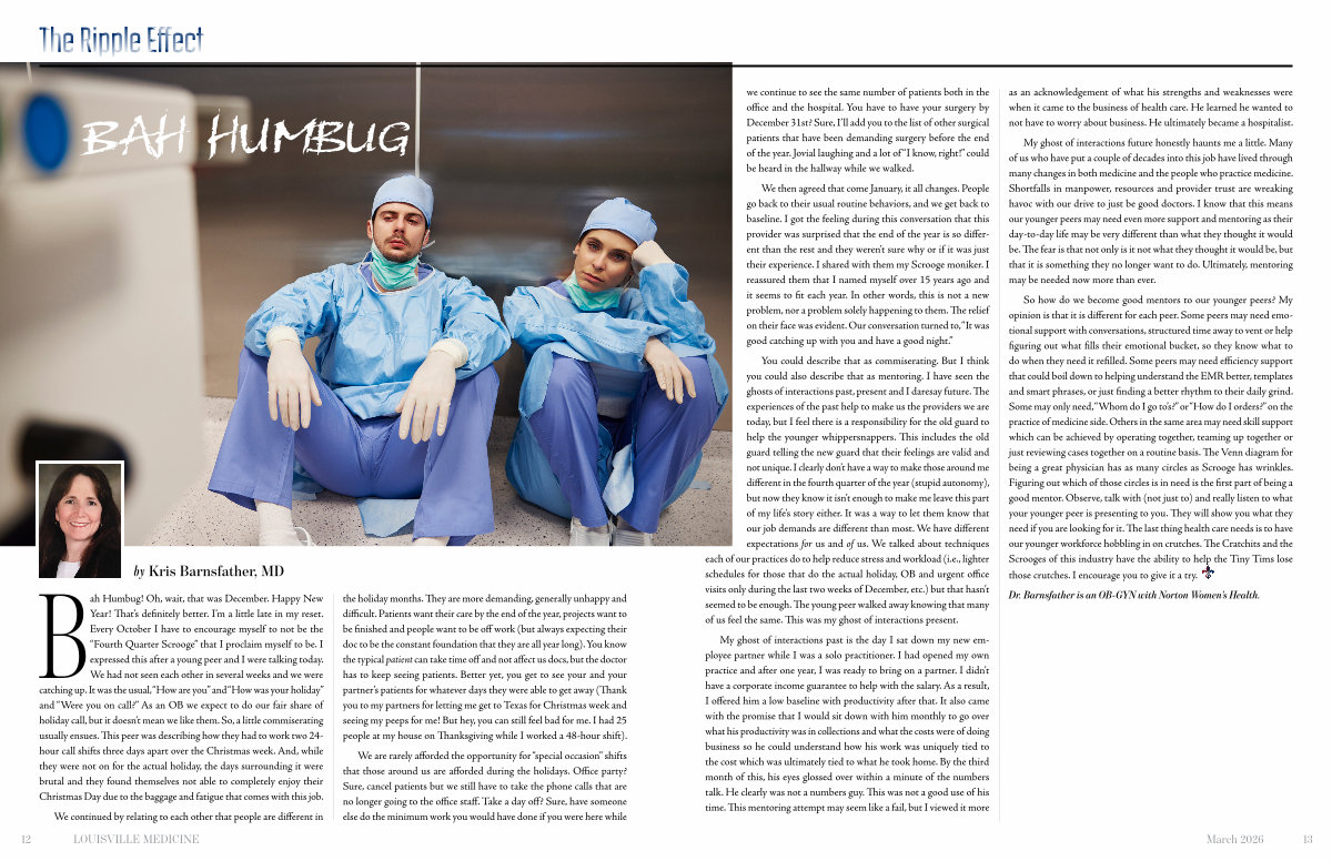 So how do we become good mentors to our younger peers? My opinion is that it is different for each peer. Some peers may need emotional support with conversations, structured time away to vent or help figuring out what fills their emotional bucket, so they know what to do when they need it refilled. Some peers may need efficiency support that could boil down to helping understand the EMR better, templates and smart phrases, or just finding a better rhythm to their daily grind. Some may only need,“ Whom do I go to’ s?” or“ How do I orders?” on the practice of medicine side. Others in the same area may need skill support which can be achieved by operating together, teaming up together or just reviewing cases together on a routine basis. The Venn diagram for being a great physician has as many circles as Scrooge has wrinkles. Figuring out which of those circles is in need is the first part of being a good mentor. Observe, talk with( not just to) and really listen to what your younger peer is presenting to you. They will show you what they need if you are looking for it. The last thing health care needs is to have our younger workforce hobbling in on crutches. The Cratchits and the Scrooges of this industry have the ability to help the Tiny Tims lose those crutches. I encourage you to give it a try.