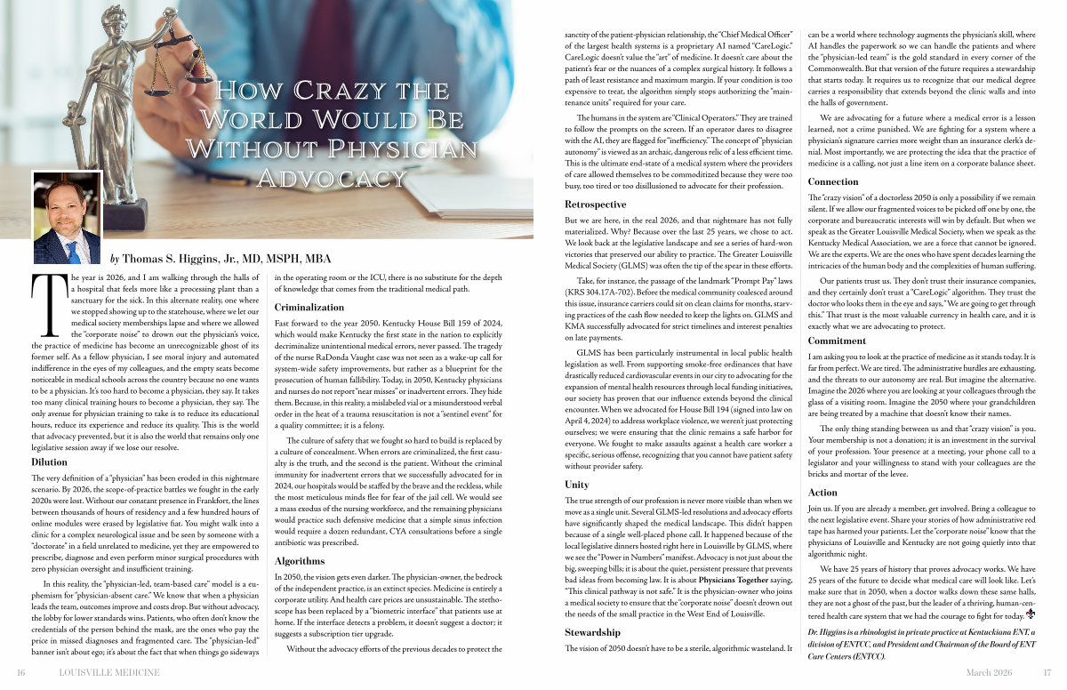The“ crazy vision” of a doctorless 2050 is only a possibility if we remain silent. If we allow our fragmented voices to be picked off one by one, the corporate and bureaucratic interests will win by default. But when we speak as the Greater Louisville Medical Society, when we speak as the Kentucky Medical Association, we are a force that cannot be ignored. We are the experts. We are the ones who have spent decades learning the intricacies of the human body and the complexities of human suffering.
